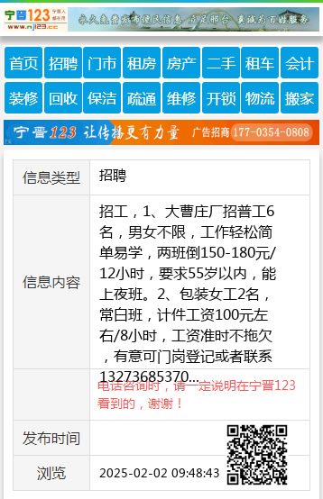 招工,1、大曹庄厂招普工6名,男女不限,工作轻松简单易学,两班倒150-180元/12小时,要求55岁以内,能上夜班。2、包装女工2名,常白班,计件工资100元左右/8小时,工资准时不拖欠,有意可门岗登记或者联系13273685370 【电话咨询时,请一定说明在宁晋123看到的,谢谢!】 |