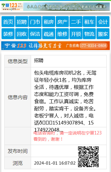 包头电缆库房司机2名,无驾证年轻小伙1名,均为库房全活,待遇优厚,根据工作态度和能力工资可调,免费食宿。工作认真诚实,吃苦耐劳,踏实肯干,设备齐全。老板宁晋人,对人诚信,电话🔇15149307894、15174922048 【电话咨询时,请一定说明在宁晋123看到的,谢谢!】 |