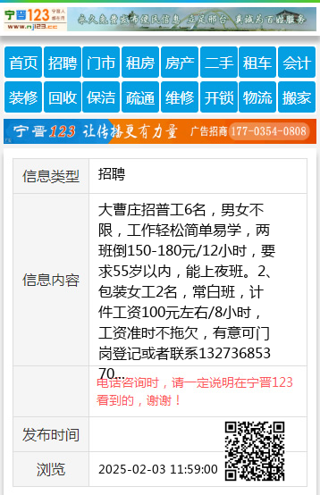 大曹庄招普工6名,男女不限,工作轻松简单易学,两班倒150-180元/12小时,要求55岁以内,能上夜班。2、包装女工2名,常白班,计件工资100元左右/8小时,工资准时不拖欠,有意可门岗登记或者联系13273685370 【电话咨询时,请一定说明在宁晋123看到的,谢谢!】 |