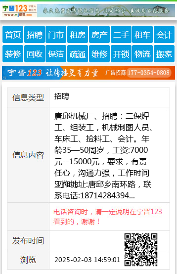 工作地址:唐邱乡南环路,联系电话:18714284394 【电话咨询时,请一定说明在宁晋123看到的,谢谢!】 |
