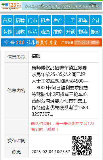 康师傅饮品招聘车销业务要求男年龄25-35岁之间已婚人士工资底薪加提成4500——8000节假日福利要求能熟练驾驶4米2厢货或三轮车吃苦耐劳沟通能力强有销售工作经验者优先联系电话15833297307 【电话咨询时,请一定说明在宁晋123看到的,谢谢!】 |