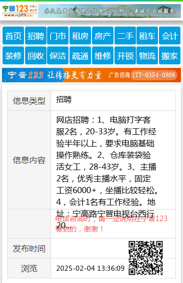 网店招聘:1、电脑打字客服2名,20-33岁。有工作经验半年以上,要求电脑基础操作熟练。2、仓库装袋验活女工,28-43岁。3、主播2名,优秀主播水平,固定工资6000+,坐播比较轻松。4,会计1名有工作经验。地址:宁高路宁晋电视台西行200米,电话:15833729191,13303194319 【电话咨询时,请一定说明在宁晋123看到的,谢谢!】 |