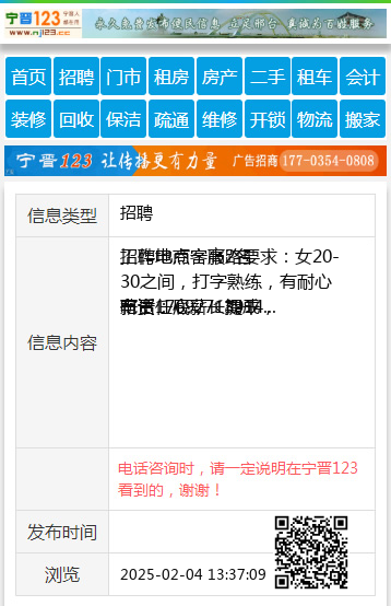 工作地点宁高路要求:女20-30之间,打字熟练,有耐心有责任心,长期干,