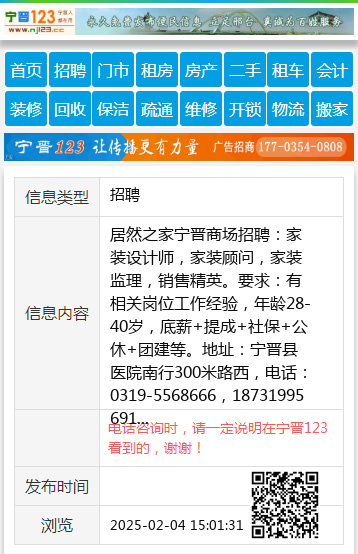 居然之家宁晋商场招聘:家装设计师,家装顾问,家装监理,销售精英。要求:有相关岗位工作经验,年龄28-40岁,底薪+提成+社保+公休+团建等。地址:宁晋县医院南行300米路西,电话:0319-5568666,18731995691 【电话咨询时,请一定说明在宁晋123看到的,谢谢!】 |