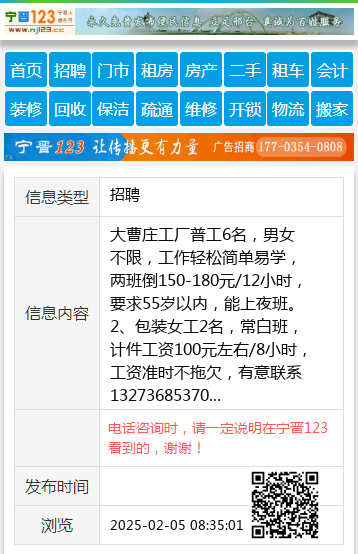 大曹庄工厂普工6名,男女不限,工作轻松简单易学,两班倒150-180元/12小时,要求55岁以内,能上夜班。2、包装女工2名,常白班,计件工资100元左右/8小时,工资准时不拖欠,有意联系13273685370 【电话咨询时,请一定说明在宁晋123看到的,谢谢!】 |