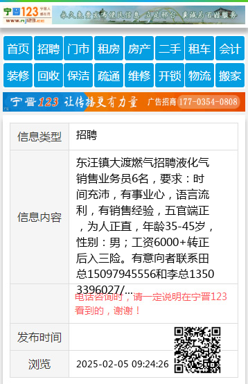 东汪镇大渡燃气招聘液化气销售业务员6名,要求:时间充沛,有事业心,语言流利,有销售经验,五官端正,为人正直,年龄35-45岁,性别:男;工资6000+转正后入三险。有意向者联系田总15097945556和李总13503396027/ 【电话咨询时,请一定说明在宁晋123看到的,谢谢!】 |