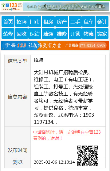 大陆村机械厂招聘质检员、维修工、电工(有电工证)、组装工、打号工、热处理校直工等数名技工,有无经验者均可,无经验者可带薪学习,提供食宿,待遇丰富,薪资面议。联系电话:19031197134 【电话咨询时,请一定说明在宁晋123看到的,谢谢!】 |