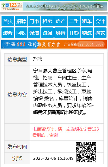 宁晋县大曹庄管理区 海河电缆厂招聘:车间主任,生产管理技术人员,绞丝技工, 挤出技工,承揽技工,束丝 编织 数名,库管统计,销售内勤业务人员,要求年龄25--50岁,保底+计件工资,