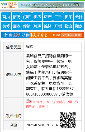 县城食品厂招聘食堂厨师一名,仅负责中午一顿饭,男女均可;包装机机长五名,熟练工优先录用,待遇好;车间普工若干名,要求踏实能干吃苦耐劳,男女皆可,长期有活。联系电话18333957808/18333980897,微信勿扰。 【电话咨询时,请一定说明在宁晋123看到的,谢谢!】 |