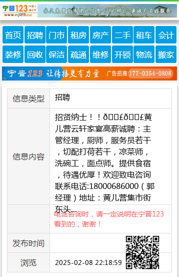 招贤纳士!!📣📣黄儿营云轩家宴高薪诚聘:主管经理,厨师,服务员若干,切配打荷若干,凉菜师,洗碗工,面点师。提供食宿,待遇优厚!欢迎致电咨询联系电话:18000686000(郭经理)地址:黄儿营集市街东头 【电话咨询时,请一定说明在宁晋123看到的,谢谢!】 |