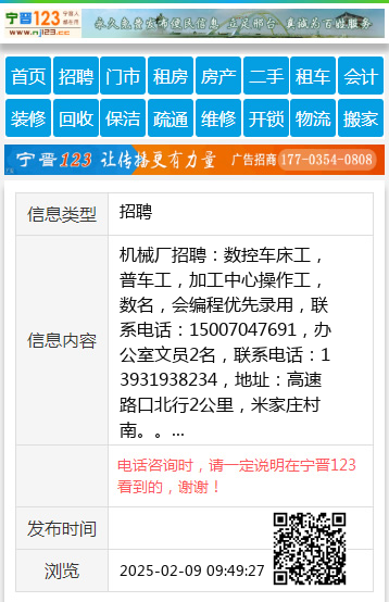 机械厂招聘:数控车床工,普车工,加工中心操作工,数名,会编程优先录用,联系电话:15007047691,办公室文员2名,联系电话:13931938234,地址:高速路口北行2公里,米家庄村南。。 【电话咨询时,请一定说明在宁晋123看到的,谢谢!】 |