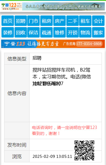 搅拌站招搅拌车司机,B2驾本,实习期勿扰。电话(微信)18713976107 地址曹伍疃村