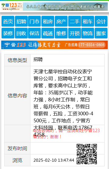 天津七星华控自动化仪表宁晋分公司,招聘电子女工和库管,要求高中以上学历,年龄:35周岁以下,动手能力强,8小时工作制,常白班,每月6天公休,节假日带薪假,五险,工资3000-4500元,工作地点,宁晋方大科技园,联系电话:17867425860罗经理 【电话咨询时,请一定说明在宁晋123看到的,谢谢!】 |
