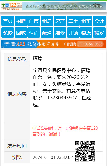 宁晋县全民健身中心,招聘前台一名,要求20-26岁之间,女,头脑灵活,喜爱运动,善于交际。有意者电话联系:13730393907,杜经理。 【电话咨询时,请一定说明在宁晋123看到的,谢谢!】 |
