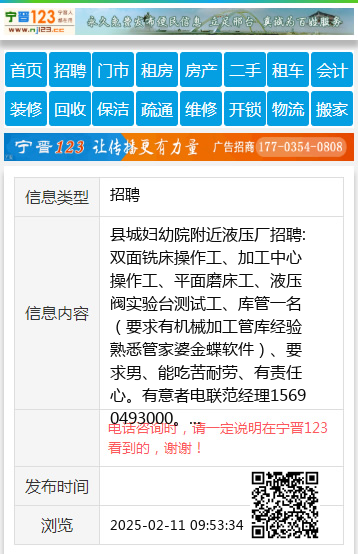 县城妇幼院附近液压厂招聘:双面铣床操作工、加工中心操作工、平面磨床工、液压阀实验台测试工、库管一名(要求有机械加工管库经验熟悉管家婆金蝶软件)、要求男、能吃苦耐劳、有责任心。有意者电联范经理15690493000。 【电话咨询时,请一定说明在宁晋123看到的,谢谢!】 |