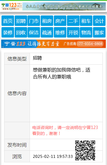 招兼职,🌹时间:早9:00-15:00,包午餐🌹工资:按量100-280元/人干完就发🌹地址:宁晋县大王庄🌹要求:18-50周岁联系电话:17334335550同v