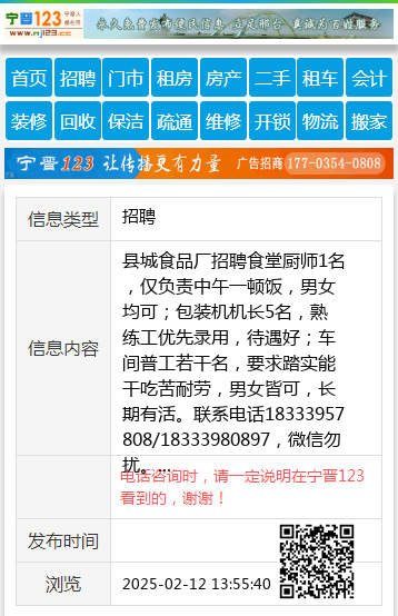 县城食品厂招聘食堂厨师1名,仅负责中午一顿饭,男女均可;包装机机长5名,熟练工优先录用,待遇好;车间普工若干名,要求踏实能干吃苦耐劳,男女皆可,长期有活。联系电话18333957808/18333980897,微信勿扰。 【电话咨询时,请一定说明在宁晋123看到的,谢谢!】 |