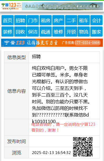 | 防骗提醒: | 宁晋123(www.nj123.cc)提醒您:手工活、网络兼职、刷单,都是骗子!凡以各种名义收取费用的都是骗子!找工作是往兜里挣钱,让你往外掏钱的都是骗子!异地招聘请提高警惕,谨防诈骗! |