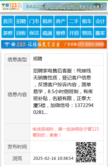 招聘家电售后客服:纯接线无销售性质,登记客户信息,反馈客户投诉内容,简单易学,8.5小时倒班制,有夜班补贴,名额有限,正泰大厦5楼,加微信号:13722940281 【电话咨询时,请一定说明在宁晋123看到的,谢谢!】 |