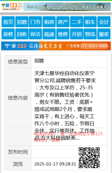 天津七星华控自动化仪表宁晋分公司,诚聘销售若干要求:大专及以上学历,25-35周岁(有销售经验者优先),男女不限。工资:底薪+提成试用期2个月,要求踏实肯干,有上进心,每天工作八个小时,五险,节假日全休,实行单双休。工作地点:方大科技园联系电话:13752055332刘经理.17867425860罗经理. 【电话咨询时,请一定说明在宁晋123看到的,谢谢!】 |