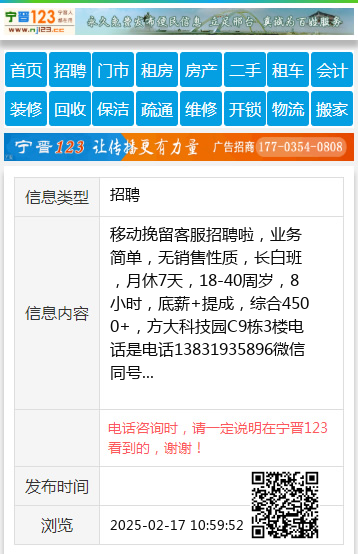 移动挽留客服招聘啦,业务简单,无销售性质,长白班,月休7天,18-40周岁,8小时,底薪+提成,综合4500+,方大科技园C9栋3楼电话是电话13831935896微信同号 【电话咨询时,请一定说明在宁晋123看到的,谢谢!】 |