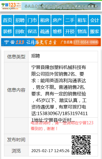 宁晋县隆创塑料机械科技有限公司招外贸销售2名、要求:能用英语流利沟通表达,男女不限。普通销售2名,要求、具有一定的销售经验,45岁以下、踏实认真,工资待遇优厚,有意可拨打电话:153830967/18531974111地址:宁晋县中近村 【电话咨询时,请一定说明在宁晋123看到的,谢谢!】 |