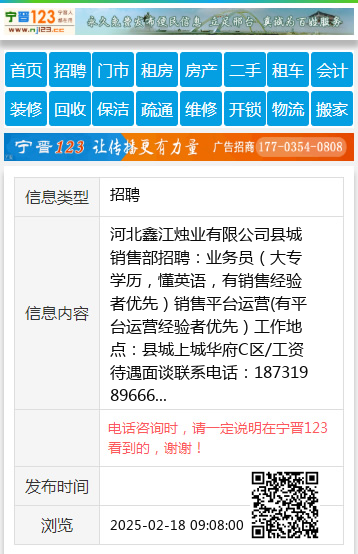 河北鑫江烛业有限公司县城销售部招聘:业务员(大专学历,懂英语,有销售经验者优先)销售平台运营(有平台运营经验者优先)工作地点:县城上城华府C区/工资待遇面谈联系电话:18731989666 【电话咨询时,请一定说明在宁晋123看到的,谢谢!】 |