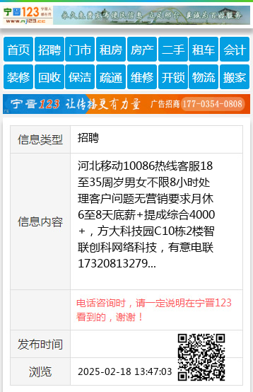 河北移动10086热线客服18至35周岁男女不限8小时处理客户问题无营销要求月休6至8天底薪+提成综合4000+,方大科技园C10栋2楼智联创科网络科技,有意电联17320813279 【电话咨询时,请一定说明在宁晋123看到的,谢谢!】 |