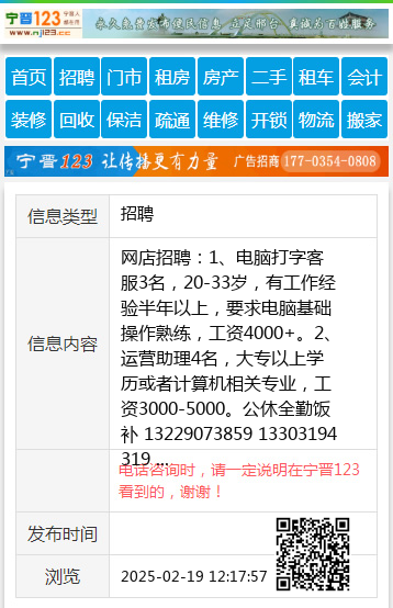 网店招聘:1、电脑打字客服3名,20-33岁,有工作经验半年以上,要求电脑基础操作熟练,工资4000+。2、运营助理4名,大专以上学历或者计算机相关专业,工资3000-5000。公休全勤饭补 13229073859 13303194319 宁高路宁晋电视台西行200米 【电话咨询时,请一定说明在宁晋123看到的,谢谢!】 |