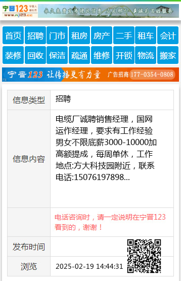 电缆厂诚聘销售经理,国网运作经理,要求有工作经验男女不限底薪3000-10000加高额提成,每周单休,工作地点:方大科技园附近,联系电话:15076197898 【电话咨询时,请一定说明在宁晋123看到的,谢谢!】 |