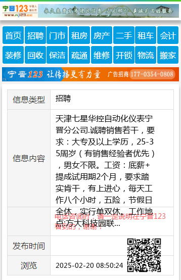 天津七星华控自动化仪表宁晋分公司.诚聘销售若干,要求:大专及以上学历,25-35周岁(有销售经验者优先),男女不限。工资:底薪+提成试用期2个月,要求踏实肯干,有上进心,每天工作八个小时,五险,节假日全休,实行单双休。工作地点:方大科技园联系电话:13752055332刘经理.17867425860罗经理, 【电话咨询时,请一定说明在宁晋123看到的,谢谢!】 |