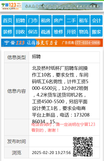 北及桥村纸杯厂招聘车间操作工10名,要求女性,车间码纸工6名男性,计件工资5000-6500元,12小时2班倒,4.2米货车送货司机2名,工资4500-5500,另招平面设计美工1名,要求会电商平台上新品,电话:17320886034,15373216896 【电话咨询时,请一定说明在宁晋123看到的,谢谢!】 |