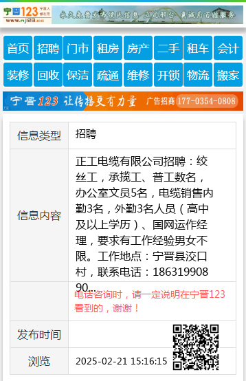 正工电缆有限公司招聘:绞丝工,承揽工、普工数名,办公室文员5名,电缆销售内勤3名,外勤3名人员(高中及以上学历)、国网运作经理,要求有工作经验男女不限。工作地点:宁晋县洨口村,联系电话:18631990890 【电话咨询时,请一定说明在宁晋123看到的,谢谢!】 |