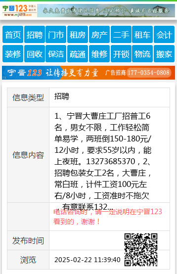 1、宁晋大曹庄工厂招普工6名,男女不限,工作轻松简单易学,两班倒150-180元/12小时,要求55岁以内,能上夜班。13273685370,2、招聘包装女工2名,大曹庄,常白班,计件工资100元左右/8小时,工资准时不拖欠,有意联系13273685370 【电话咨询时,请一定说明在宁晋123看到的,谢谢!】 |