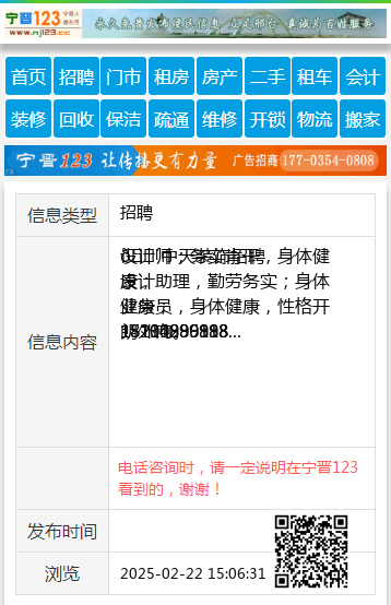 | 防骗提醒: | 宁晋123(www.nj123.cc)提醒您:手工活、网络兼职、刷单,都是骗子!凡以各种名义收取费用的都是骗子!找工作是往兜里挣钱,让你往外掏钱的都是骗子!异地招聘请提高警惕,谨防诈骗! |