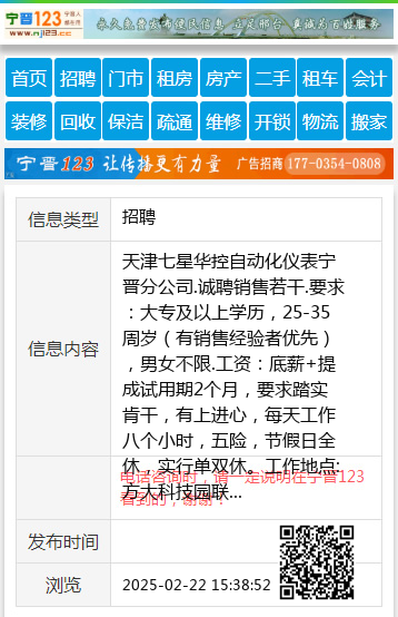 天津七星华控自动化仪表宁晋分公司.诚聘销售若干.要求:大专及以上学历,25-35周岁(有销售经验者优先),男女不限.工资:底薪+提成试用期2个月,要求踏实肯干,有上进心,每天工作八个小时,五险,节假日全休,实行单双休。工作地点:方大科技园联系电话:13752055332刘经理.17867425860罗经理,