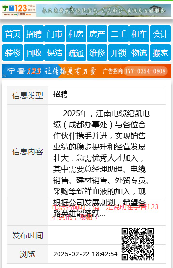 2025年,江南电缆纪凯电缆(成都办事处)与各位合作伙伴携手并进,实现销售业绩的稳步提升和经营发展壮大,急需优秀人才加入,其中需要总经理助理、电缆销售、建材销售、外贸专员、采购等新鲜血液的加入,现根据公司发展规划,希望各路英雄能踊跃参与,共创你我之梦想,共达你我之目标,联系电话:曹经理18227655819微信同号。 【电话咨询时,请一定说明在宁晋123看到的,谢谢!】 |