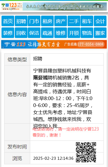 高薪诚聘机械销售2名,具有一定的销售经验,底薪+高提成,待遇优厚,时间白班:早8:00-12:00,下午1:00-6:00,要求:25-45周岁,女士优先考虑,地址:宁晋县城西。想挣钱就来找我,欢迎您加入我们的团队,联系电话:153830967/15130903022 【电话咨询时,请一定说明在宁晋123看到的,谢谢!】 |