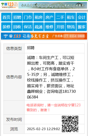 诚聘:车间生产工,可以短期出差,可爬高,踏实肯干,8小时工作有食宿单休,25-35岁;另,诚聘维修工,绞线操作工,挤压操作工,踏实肯干,薪资面议,地址鑫晖铜业;咨询电话18173006384