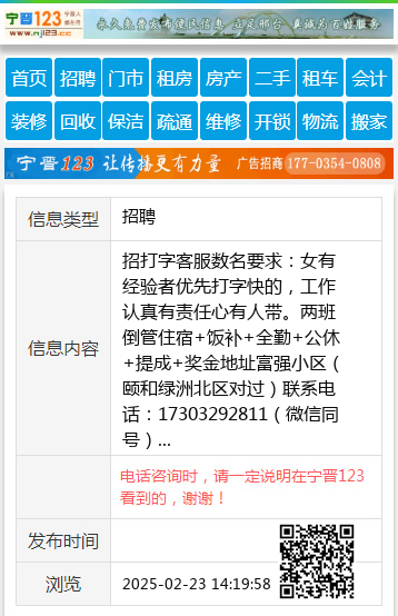 招打字客服数名要求:女有经验者优先打字快的,工作认真有责任心有人带。两班倒管住宿+饭补+全勤+公休+提成+奖金地址富强小区(颐和绿洲北区对过)联系电话:17303292811(微信同号) 【电话咨询时,请一定说明在宁晋123看到的,谢谢!】 |