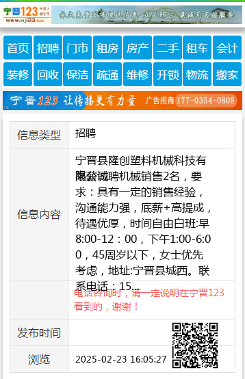 高薪诚聘机械销售2名,要求:具有一定的销售经验,沟通能力强,底薪+高提成,待遇优厚,时间自由白班:早8:00-12:00,下午1:00-6:00,45周岁以下,女士优先考虑,地址:宁晋县城西。联系电话:15383096707/15130903022 【电话咨询时,请一定说明在宁晋123看到的,谢谢!】 |
