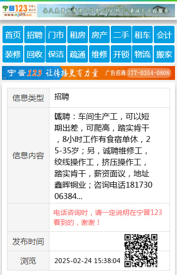 诚聘:车间生产工,可以短期出差,可爬高,踏实肯干,8小时工作有食宿单休,25-35岁;另,诚聘维修工,绞线操作工,挤压操作工,踏实肯干,薪资面议,地址鑫晖铜业;咨询电话18173006384 【电话咨询时,请一定说明在宁晋123看到的,谢谢!】 |