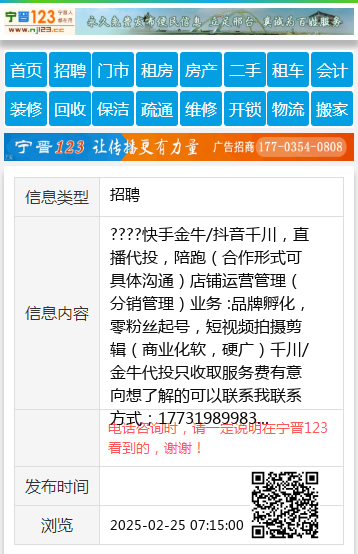 ????快手金牛/抖音千川,直播代投,陪跑(合作形式可具体沟通)店铺运营管理(分销管理) 业务 :品牌孵化,零粉丝起号,短视频拍摄剪辑(商业化软,硬广) 千川/金牛代投只收取服务费 有意向想了解的可以联系我 联系方式;17731989983