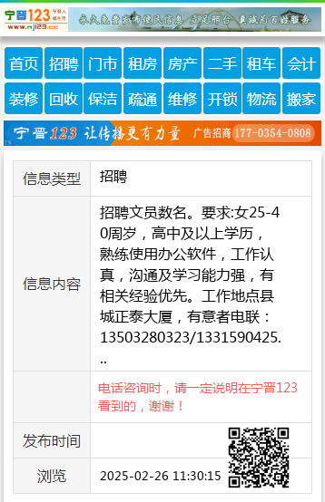 招聘文员数名。要求:女25-40周岁,高中及以上学历,熟练使用办公软件,工作认真,沟通及学习能力强,有相关经验优先。工作地点县城正泰大厦,有意者电联:13503280323/1331590425 【电话咨询时,请一定说明在宁晋123看到的,谢谢!】 |