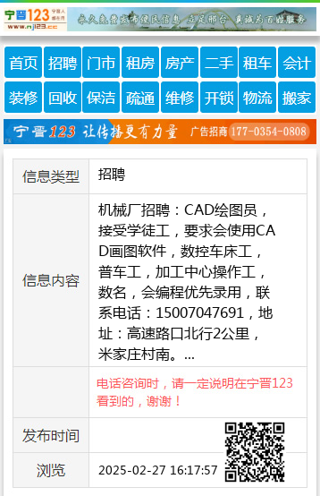 机械厂招聘:CAD绘图员,接受学徒工,要求会使用CAD画图软件,数控车床工,普车工,加工中心操作工,数名,会编程优先录用,联系电话:15007047691,地址:高速路口北行2公里,米家庄村南。 【电话咨询时,请一定说明在宁晋123看到的,谢谢!】 |