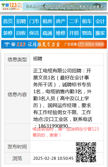 正工电缆有限公司招聘:开票文员1名(最好在会计事务所干活),诚聘标书专员1名,电缆销售内勤3名,外勤3名人员(高中及以上学历)、国网运作经理,要求有工作经验男女不限、工作地点:洨口工业区,联系电话:18631990890 【电话咨询时,请一定说明在宁晋123看到的,谢谢!】 |