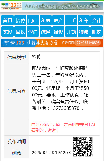 配胶岗位:车间配胶处招聘男工一名,年岭50岁以内,长白班,12小时,月工资6000元。试用期一个月工资5000元。要求:工作认真,吃苦耐劳,踏实有责任心。联系电话:13273685370 【电话咨询时,请一定说明在宁晋123看到的,谢谢!】 |