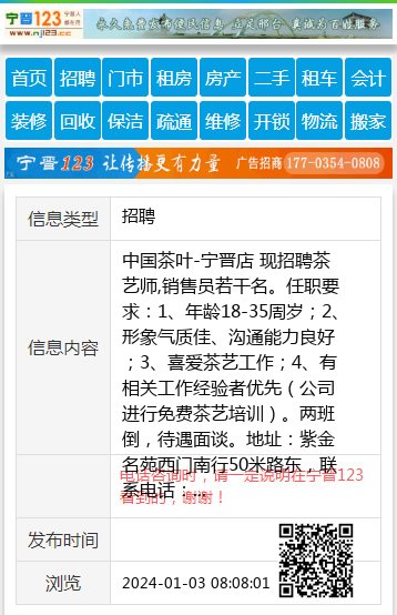 中国茶叶-宁晋店 现招聘茶艺师,销售员若干名。任职要求:1、年龄18-35周岁;2、形象气质佳、沟通能力良好;3、喜爱茶艺工作;4、有相关工作经验者优先(公司进行免费茶艺培训)。两班倒,待遇面谈。地址:紫金名苑西门南行50米路东,联系电话:武女士17731922258,赵先生13730484623 【电话咨询时,请一定说明在宁晋123看到的,谢谢!】 |