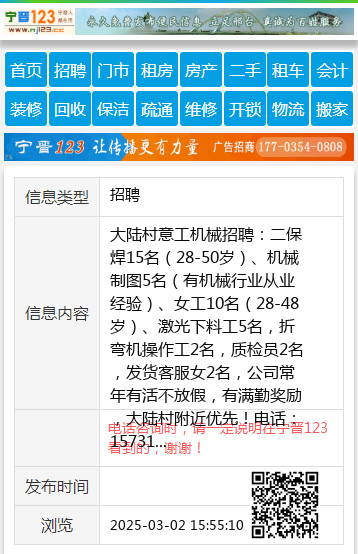 大陆村意工机械招聘:二保焊15名(28-50岁)、机械制图5名(有机械行业从业经验)、女工10名(28-48岁)、激光下料工5名,折弯机操作工2名,质检员2名,发货客服女2名,公司常年有活不放假,有满勤奖励,大陆村附近优先!电话:15731933399电话:13513197483 【电话咨询时,请一定说明在宁晋123看到的,谢谢!】 |