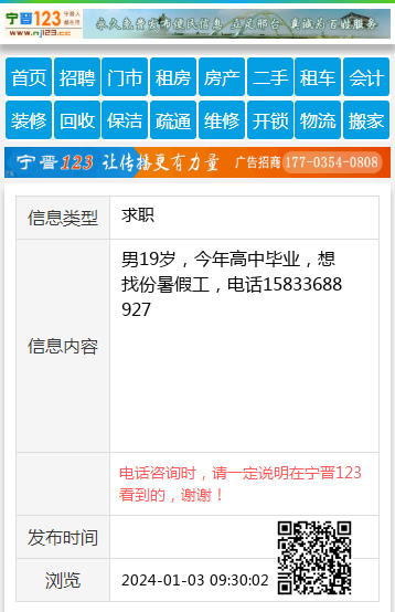 男19岁,今年高中毕业,想找份暑假工,电话15833688927